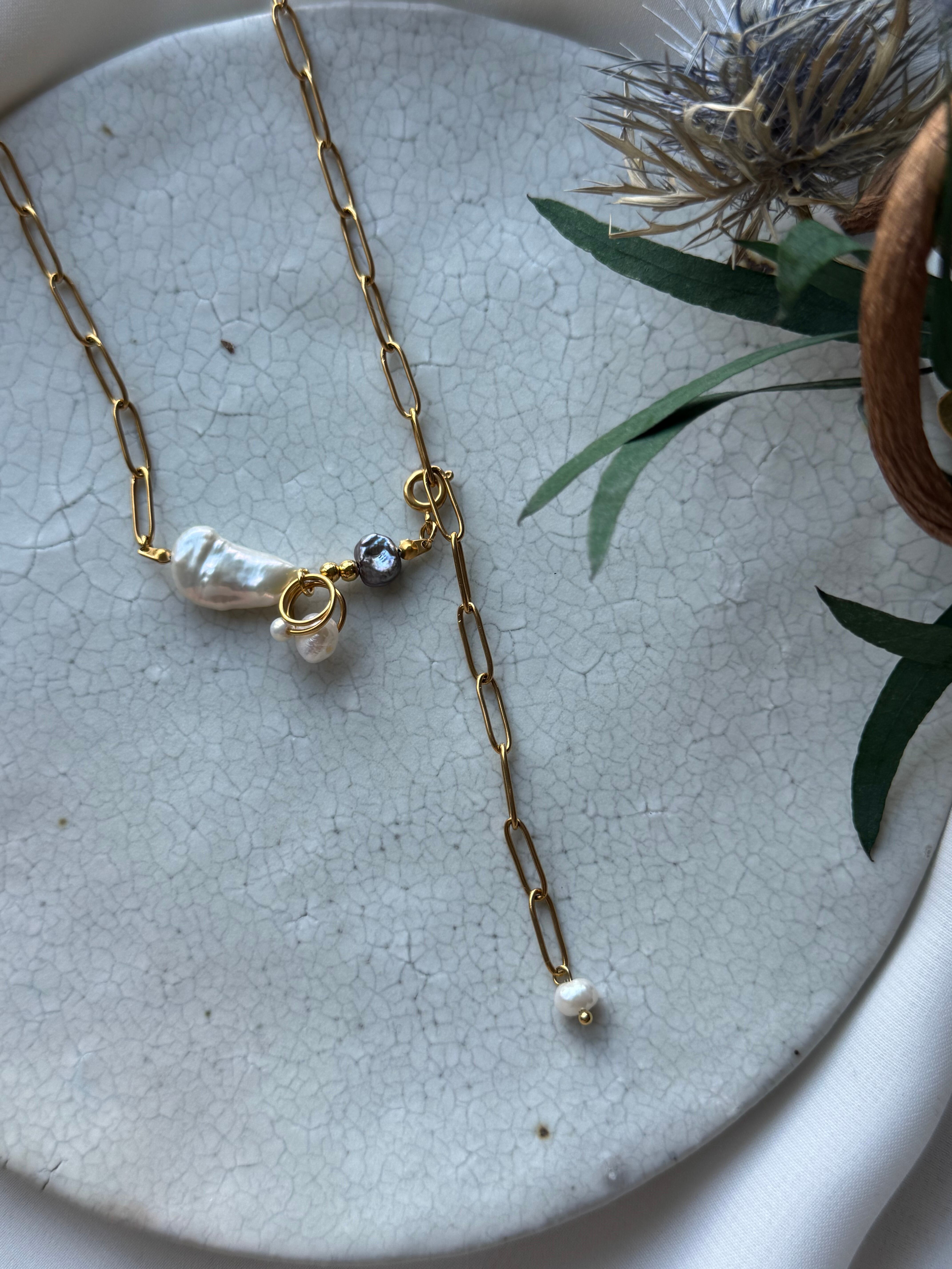 金具を付ける位置によって、長さが調節でき、印象も変わるネックレス。