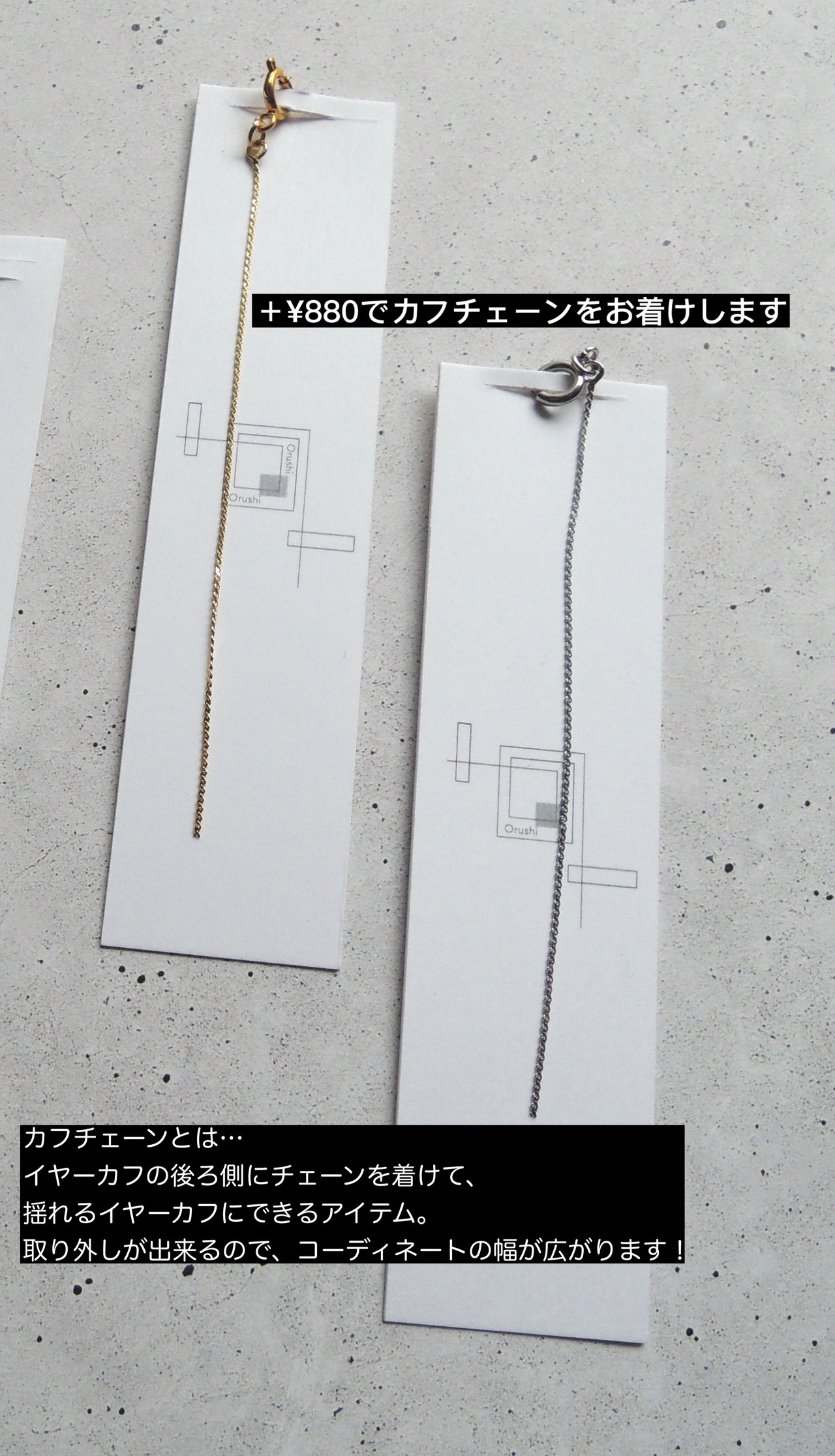 オプションのカフチェーンをお選びいただくと、イヤーカフの後ろ側(丸い輪っか部分)につけて、揺れるアイテムとなります。